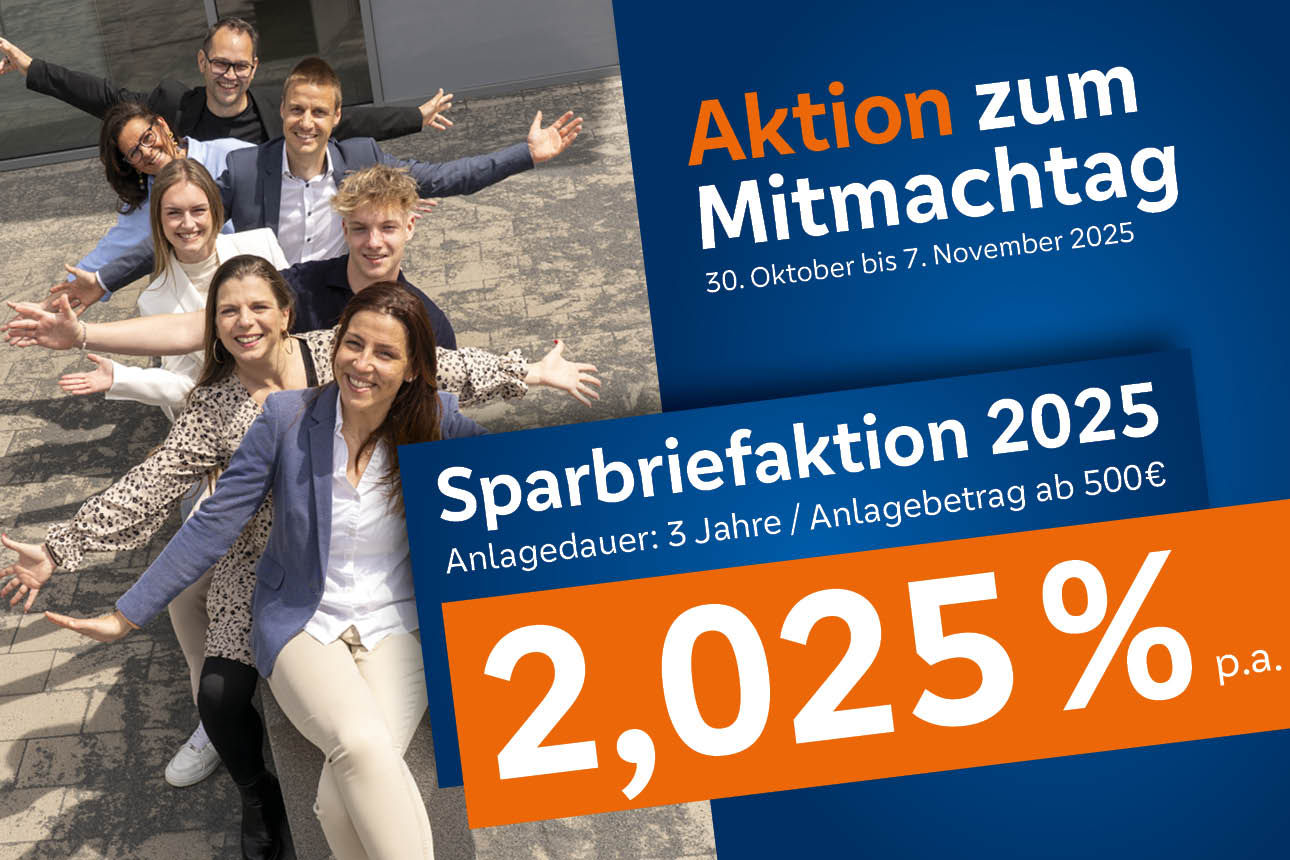 Der Mitmachtag ist ein schöner Anlass, die eigenen Sparanlagen zu prüfen. Wir bieten Ihnen interessante Perspektiven für die persönliche Geldanlage. Sprechen Sie uns jederzeit gerne an!